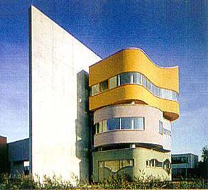 Дом-стенаДом в Гронингене (Нидерланды) в Гронингене, автор которого Джон Хейдак, - единственный реализованный проект из целой серии "домов-стен"; внешне он напоминает лежащего трехглавого сфинкса. Ключевой элемент композиции, собирающий ее в единое целое, - мощная стена из бетона. Она отделяет служебное помещение от жилых, которые помещены в три "уложенных" друг на друга разноцветных объема. На первом этаже находится спальня, на втором - кухня и столовая, а на третьем - гостиная. Яркие цвета и криволинейные формы жилых пространств контрастируют с жесткой геометрией серой галереи и лестничной башни, расположенных по другую сторону стены.