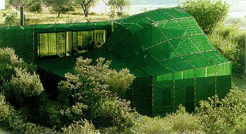 Дом-камуфляжЭтот частный дом Амии и Джудит Барак в Ниме (Франция) спроектировали Франсуа Рош и Стефании Лаво. Строительство велось в зоне охраняемого ландшафта неподалеку от старинного замка, чем и обусловлено создание дома-камуфляжа, практически сливающегося с окружением. Форму подсказала топография участка: силуэт здания повторяет изломы рельефа. Рукотворный ландшафт имитирует природный - архитектура превращается в "тектоническую деятельность". Постройка задрапирована темно-зеленой сеткой из пластика, натянутой на металлический каркас; при необходимости ее можно снять. Тент защищает от летней жары и от насекомых, перекрывая несколько большее пространство, нежели объем дома. В будущем его удастся расширить, минуя согласующие инстанции.