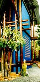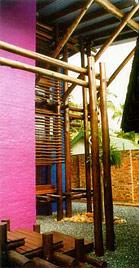 Дом-тропикиФасад, вырастающий из джунглей как причудливое растение. Интерьер, растворяющийся в зелени пальм. Дом-находка для любителей экзотики! Перед вами проект южноафриканского архитектора Оры Юбертс. Все материалы и конструкции для него подбирались в расчете на особенности влажного тропического климата с регулярными проливными дождями. Основной архитектурный сюжет - контраст тяжелых каменных объемов, деревянных каркасов и хрупкого стекла. Прагматизм сочетается с живописным декором. Дом воспринимается как сгусток красок и форм тропической природы. Первое, что привлекает взгляд, - крупные клетки балок и столбов опорных конструкций кровли. Как и напольные покрытия, они сделаны из местного камедного дерева: оно отличается долговечностью и устойчивостью к сырости. У самых опорных столбов посажены молодые деревья - естественная декорация и защита остекленных стен от солнца. Многочисленные окна - это еще и "дыхательная система", избавляющая интерьеры от сырости. Кровли с большими уютными выносами и навесы покрыты специальным отражающим материалом. Каменная кладка жилых объемов хороший теплоизолятор. Лестница кажется частью окружающего леса. Здание отлично вписано в небольшой участок.